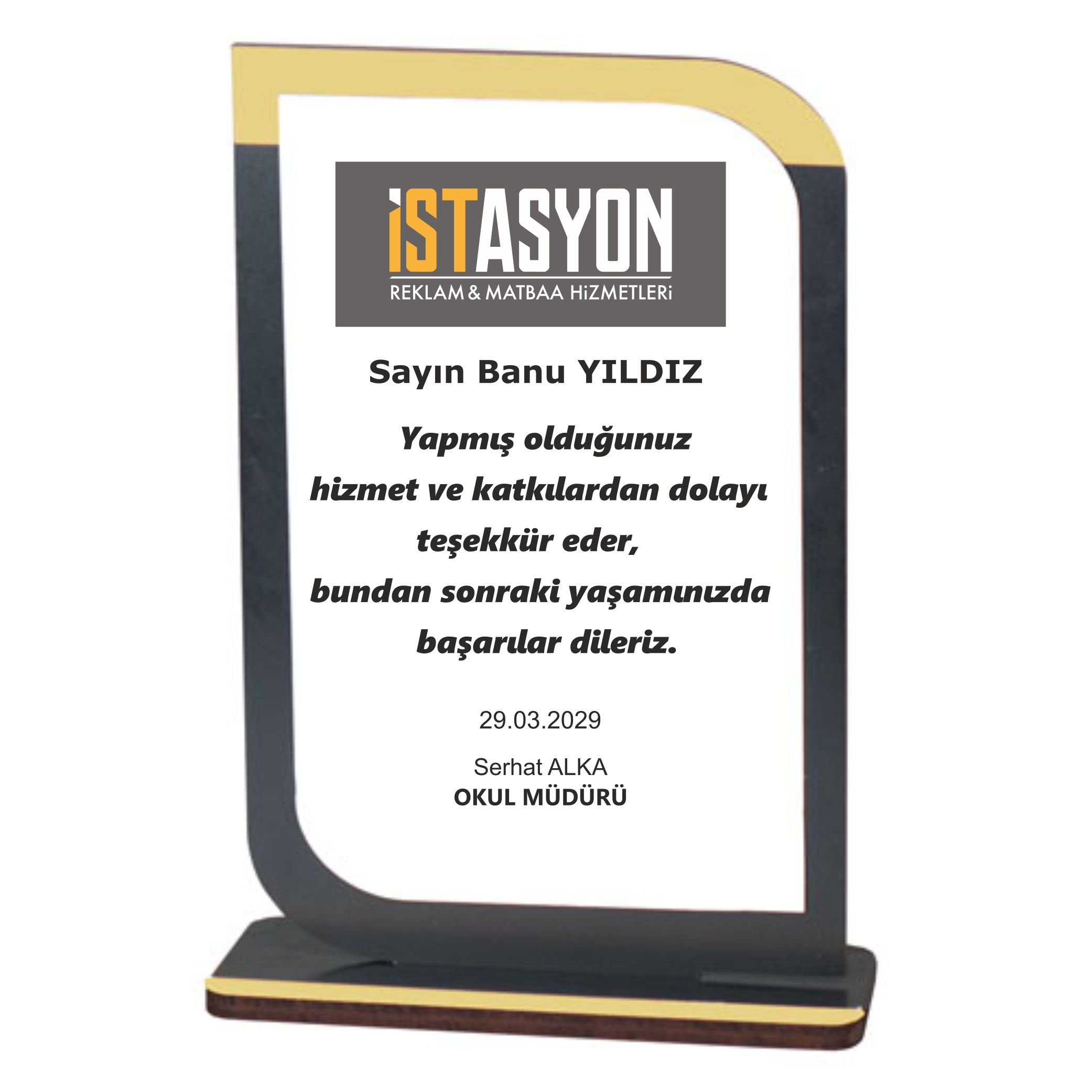 Ürün İçeriği : 1 Adet MDF Ahşap Ödül Plaketi , 1 Adet Baskı Metali , 1 Adet MDF Ayak