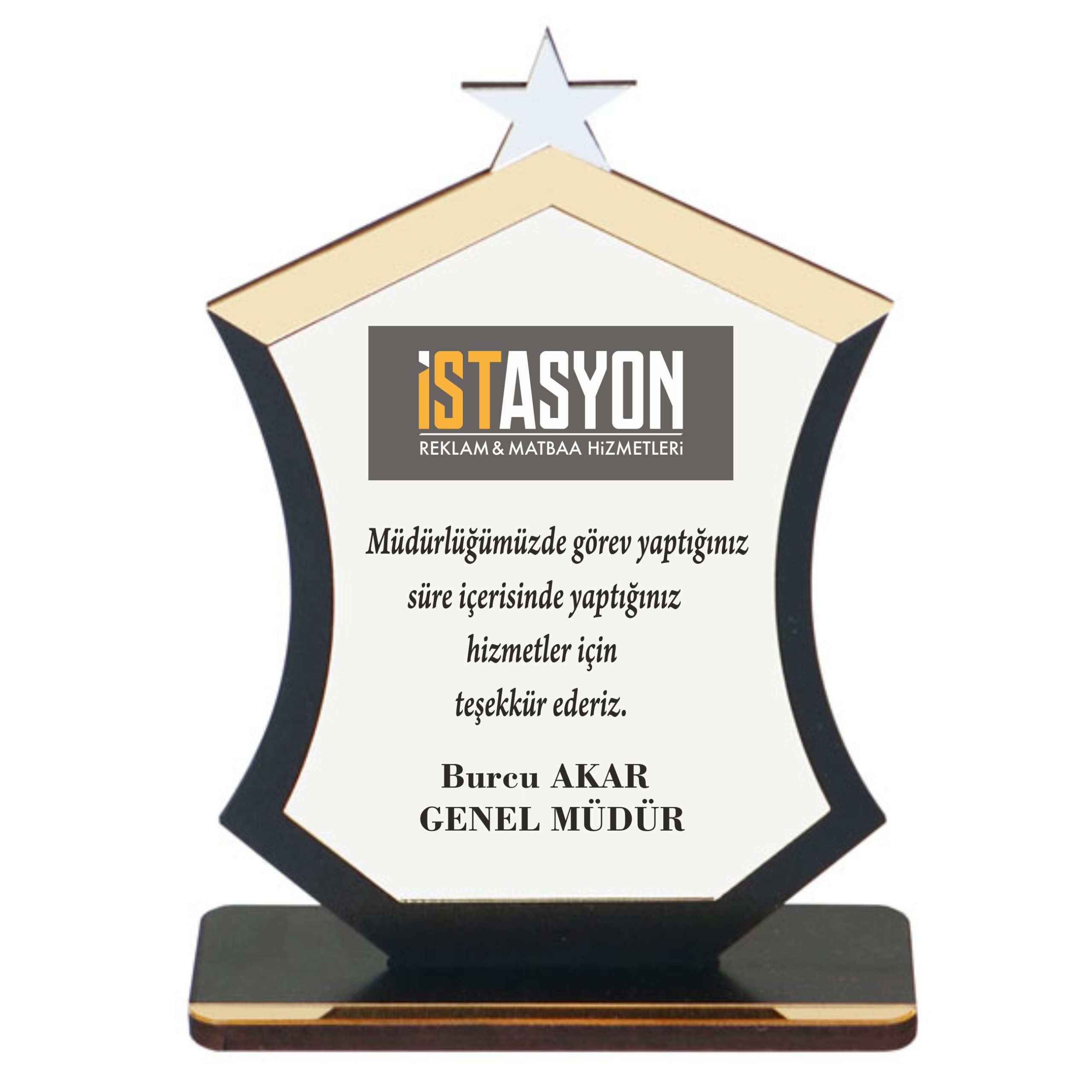 Ürün İçeriği : 1 Adet MDF Ahşap Ödül Plaketi 12×18 cm , 1 Adet Baskı Metali 10×13 cm , 1 Adet MDF Ayak 5 x 13 cm