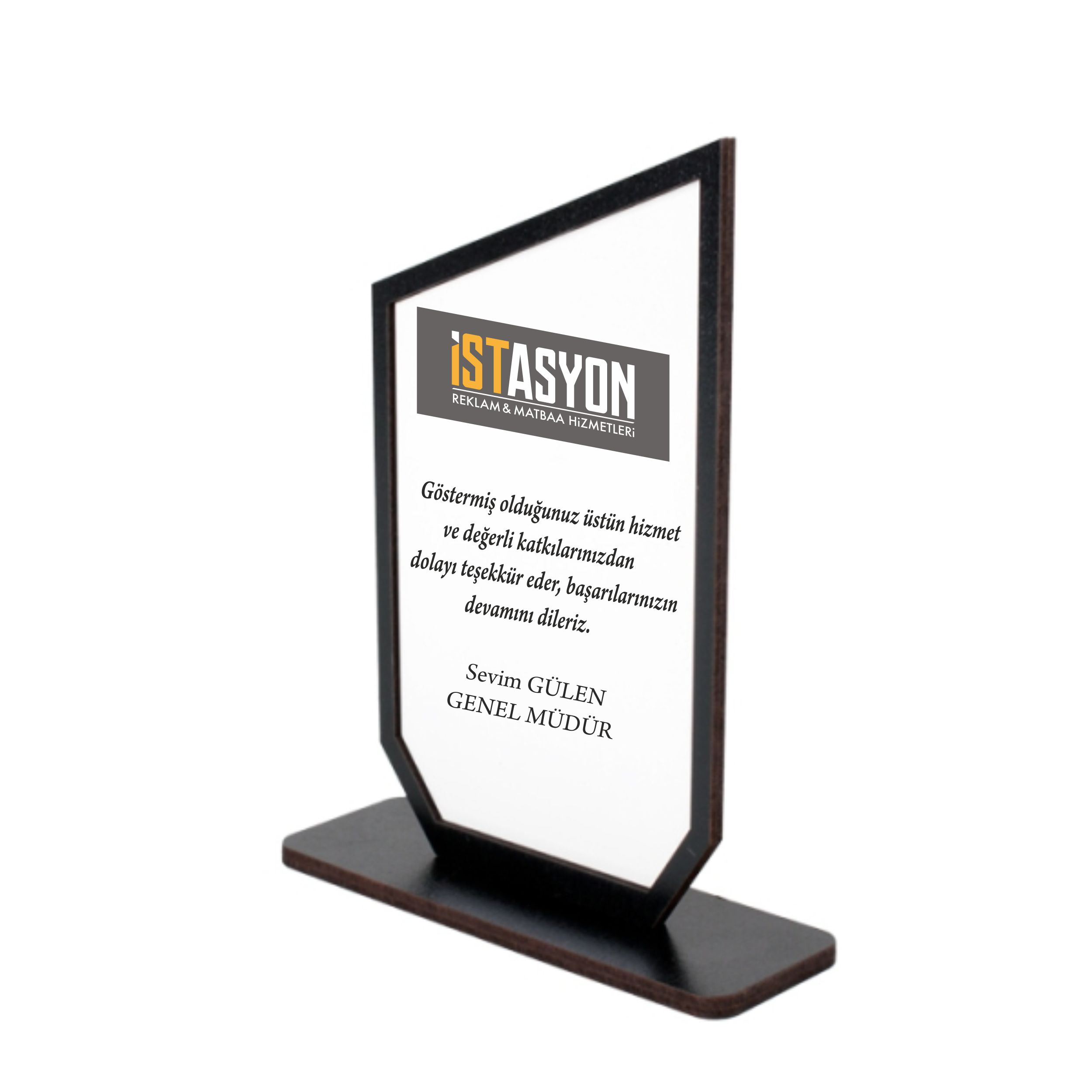 Ürün İçeriği : 1 Adet MDF Ahşap Ödül Plaketi 11 x 19 cm, 1 Adet Baskı Metali 9.5 x 17 cm, 1 Adet MDF Ayak 5 x 15 cm